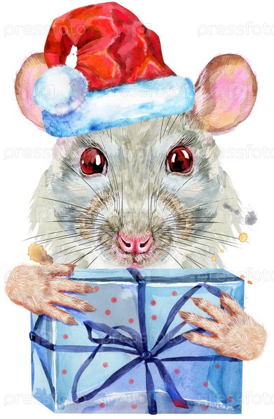 Милая белая крыса с подарком в шляпе Санты для графики на футболках. Акварельная иллюстрация крысы