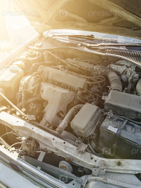 Открытый капот автомобиля. Грязный двигатель машины. Устранение неполадок двигателя. Солнечная подсветка рамы. Выборочный фокус, размытие, расфокусировка, зернистость