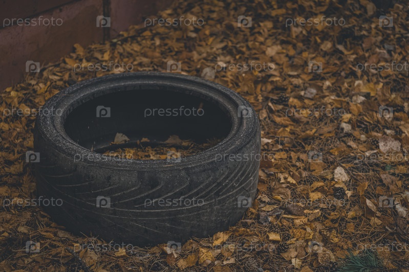 Подержанная шина. Старая автомобильная шина среди осенних листьев. Брошенное колесо от автомобиля. Выборочный фокус