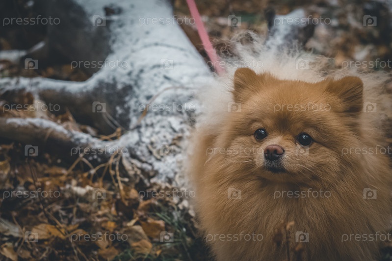 Собака породы шпиц на прогулке в зимнем лесу. Первый снег. Портрет питомца. Выборочный фокус