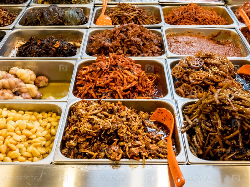 Ассорти из традиционных корейских ферментированных блюд на прилавке рынка Кванджанг. Сеул, Южная Корея