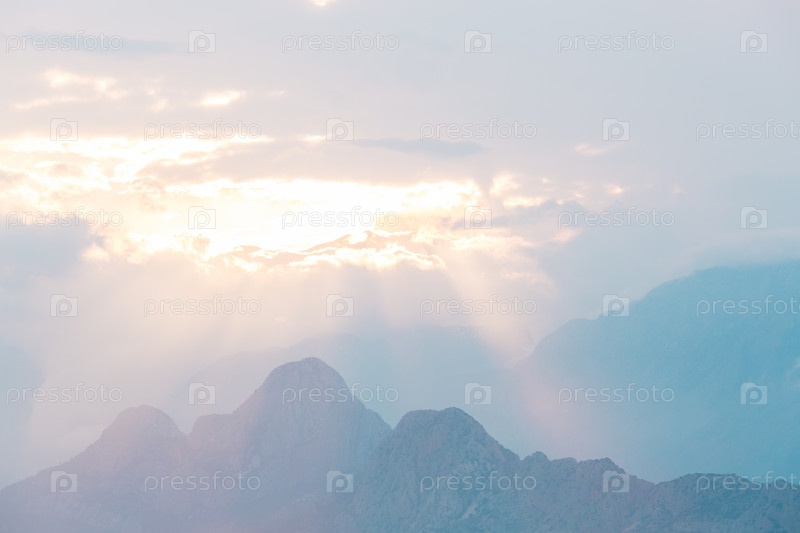 Закат в горах, солнечные лучи пробиваются сквозь облака и освещают горы