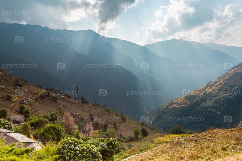 Азиатская горная деревня с террасами осенью, заповедник Аннапурна, Гималаи, Непал