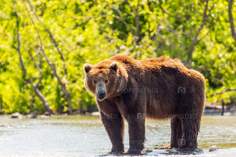 Бурый медведь или Ursus arctos beringianus ловит рыбу в Курильском озере. полуостров Камчатка, Россия