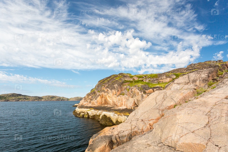 Береговая линия Баренцева моря северным полярным летом. Северный Ледовитый океан, Кольский полуостров, Россия