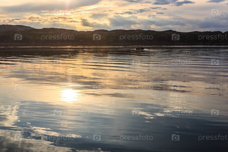 Тихий красивый золотой закат на Баренцевом море, арктическое лето
