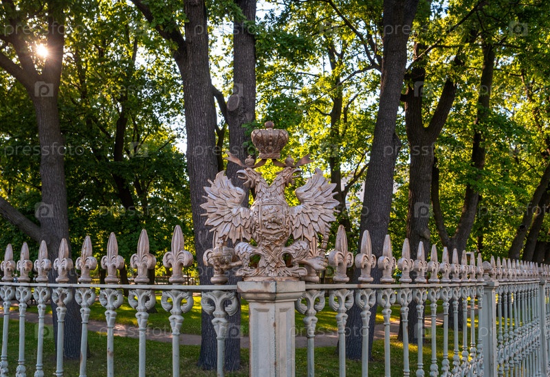 Двуглавый имперский орел. Декоративный элемент забора сада. Санкт-Петербург, Россия