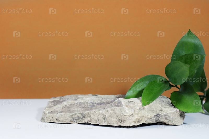 Креативный макет красочных листьев риска на белом бежевом фоне в лучах солнца с тенями. Витрина с зелеными листьями и каменным натуральным подиумом, эко-подиумом и платформой