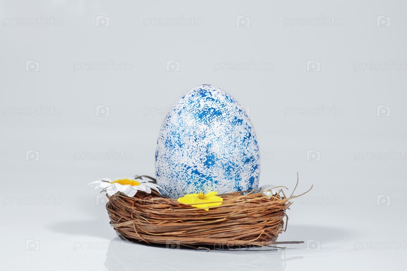 Пасхальная открытка. Тонированное синее куриное яйцо в гнезде с цветами, изолированное на сером фоне. Пасхальная концепция. Копировать пространство