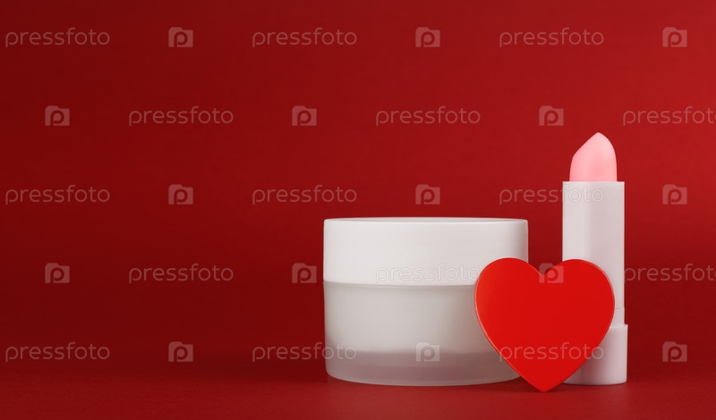 Банка крема и бальзама для губ на красном фоне с сердцем. Контейнер для бальзама по уходу за телом. Концепция фона на День святого Валентина. Пустая реклама с копией пространства. Баннер