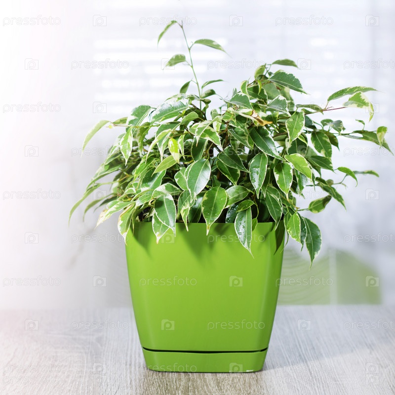 Фикус Бенджамина, крупный план, в зеленом горшке на фоне окна, на солнце. Вечнозеленые комнатные растения