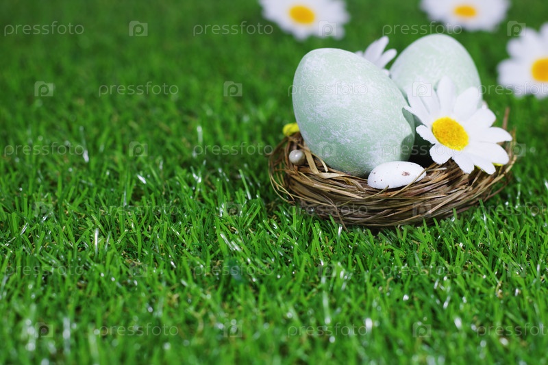 Пасхальный фон. Выборочный фокус. Пасхальные яйца в корзине на лугу с цветами. Концепция пасхальной открытки. Копировать пространство