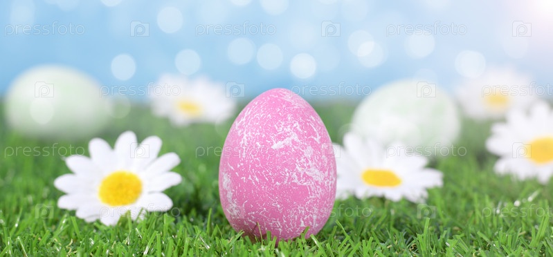 Пасхальный фон. Выборочный фокус. Пасхальные яйца на лугу с цветами, на фоне неба и боке. Концепция пасхальной открытки. Баннер