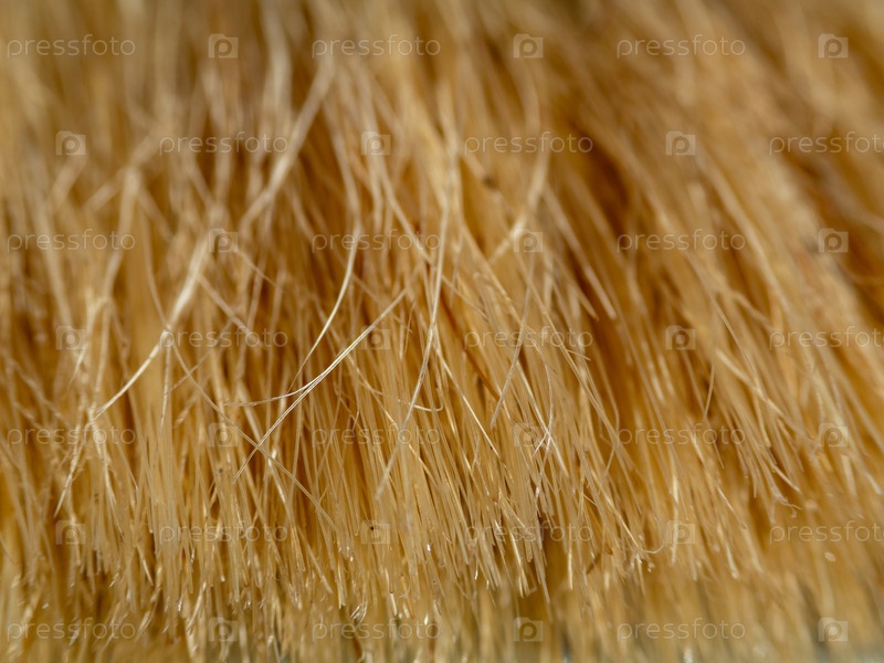 Макросъемка щетинок кисти, малая глубина резкости, фокус в центре. Абстрактный текстурированный светло-желтый фон. Крупный план щетинок кисти для рисования, для фона