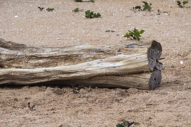 Крупный план сухого ствола дерева с красивой структурой на морском пляже. Бревно, выброшенное морем на песчаный пляж