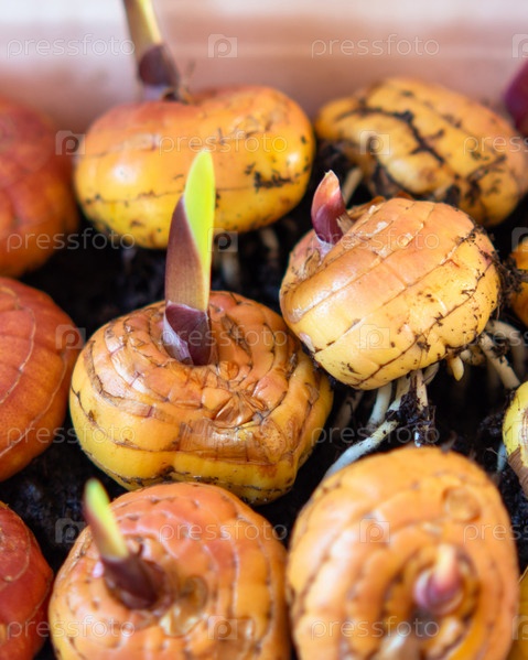 Проросшие луковицы гладиолусов в контейнере с почвой. Луковицы гладиолуса перед посадкой в качестве фона. Гладиолусы готовы к посадке. Клубнелуковицы гладиолусов. Концепция весеннего садоводства. Выборочный фокус