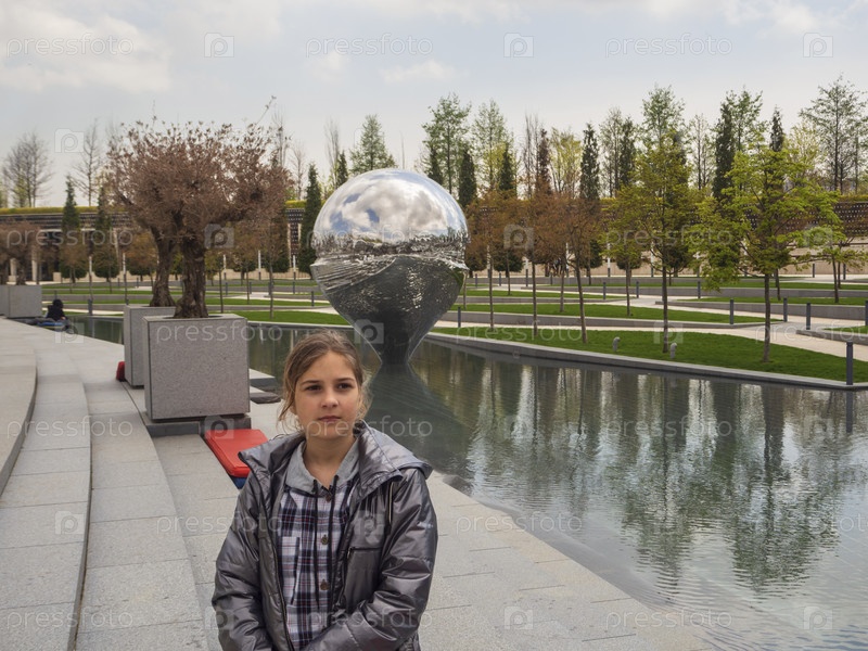 Красивая девушка в сером жакете смотрит вдаль, стоя у воды искусственного пруда в общественном парке ранней весной. Девочка-подросток на ступеньках в зоне отдыха