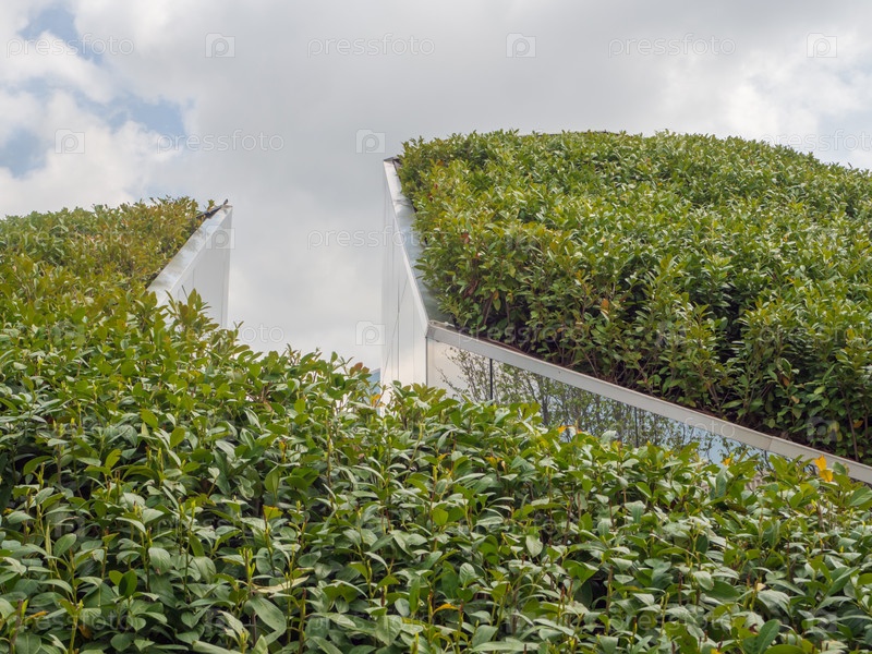 Растения с зелеными листьями устремляются ввысь. Ландшафтный дизайн, кусты, уходящие в облачное небо, летний сезон в парке
