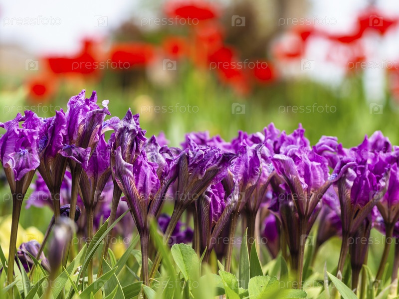 Фиолетовые весенние цветы ирисы на лугу - весеннее пробуждение. Красивые фиолетовые цветы, растущие в траве, первый признак весны. Сезонный весенний цветочный пасхальный фон