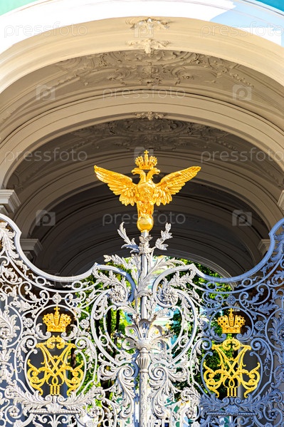 Санкт-Петербург, Россия. Золотой двуглавый орел на воротах Государственного Эрмитажа. Дворцовая площадь