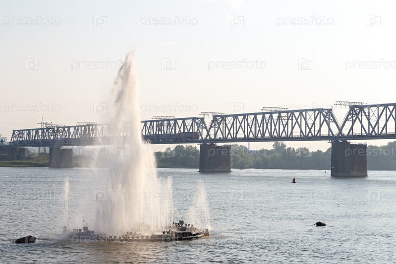 Россия, Новосибирск. По мосту проходят поезда. Железнодорожный мост через реку Обь. За фонтаном