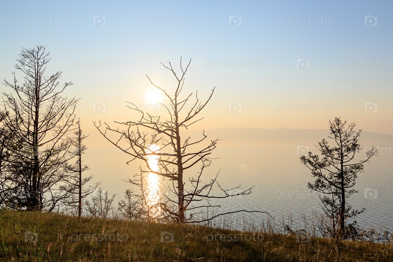 Заходящее солнце за ветвями деревьев над заливом Малого Байкала. Россия, остров Ольхон