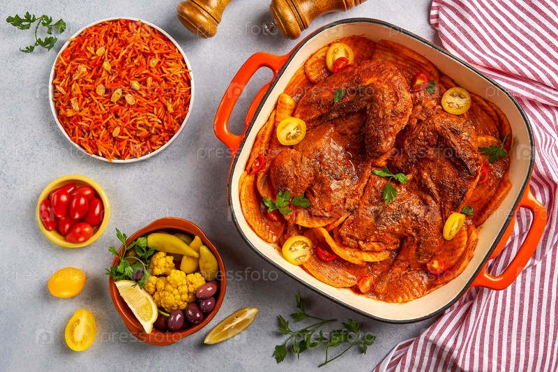 Жареная курица с картофелем в красном соусе. Вид сверху