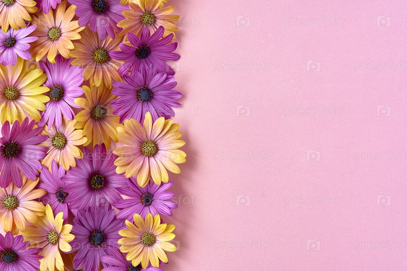 Розовые и желтые цветы ромашки на розовом фоне. Вид сверху, плоская планировка с копией пространства