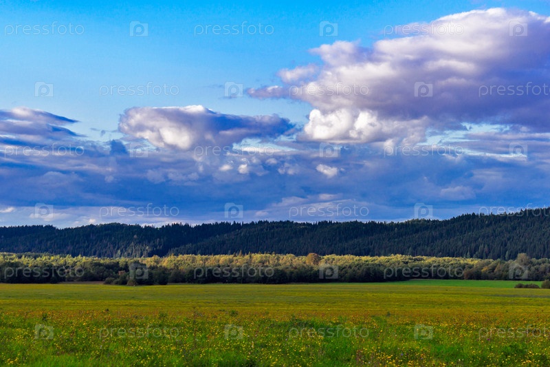 Луг и холмы с хвойным лесом вдали