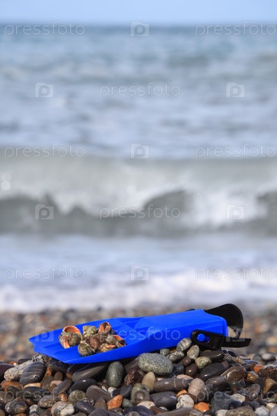 Ласт с ракушками на каменистом пляже