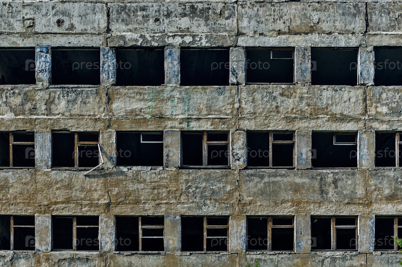 Бетонная стена старого разрушенного дома с разбитыми окнами