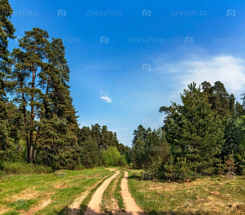 Грунтовая дорога в сосновом лесу в солнечный летний день