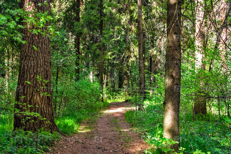 Грунтовая дорога в лесу в солнечный летний день
