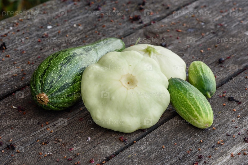 Цуккини, две патиссоны и огурцы, собранные с грядок