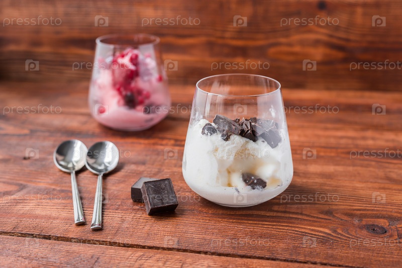Сладкая пустыня с мороженым, шоколадом и ягодами