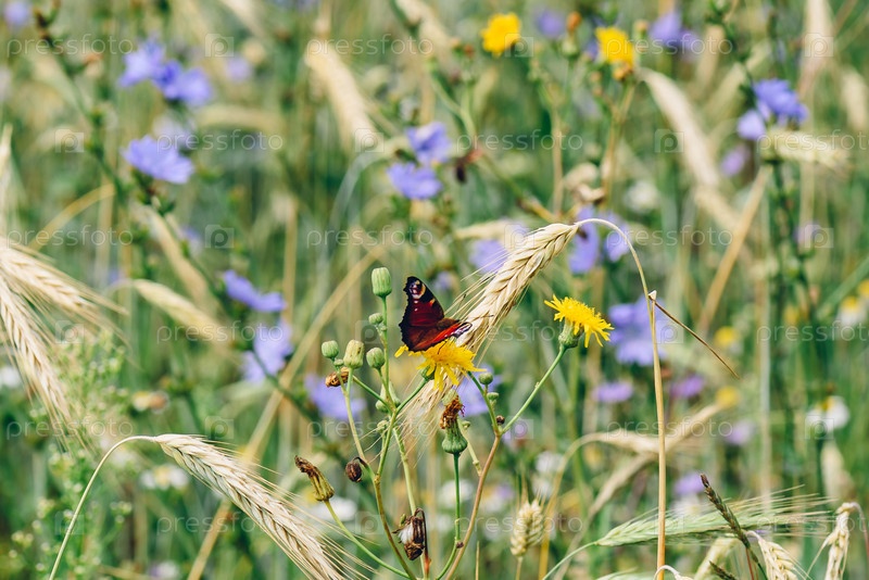 Европейская бабочка-павлин на желтом цветке