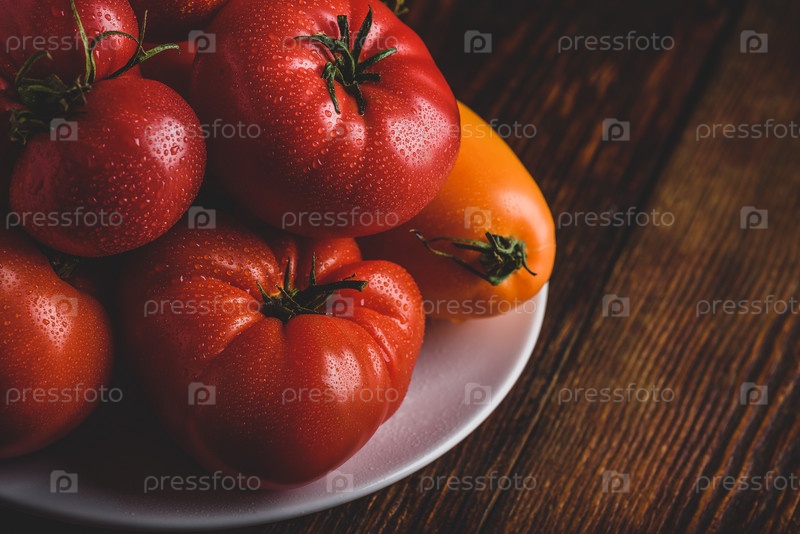 Свежие красные и желтые помидоры на тарелке