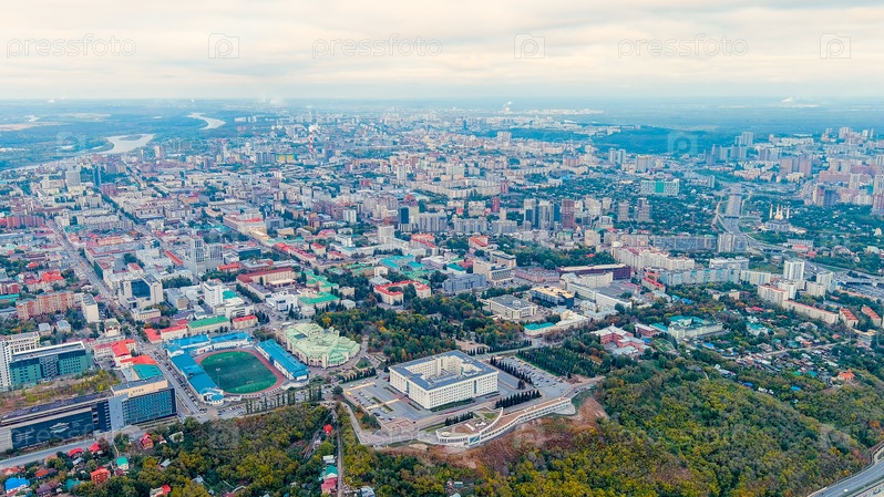 Уфа, Россия. Панорама центральной части города Уфы. Время после захода солнца, вид с воздуха