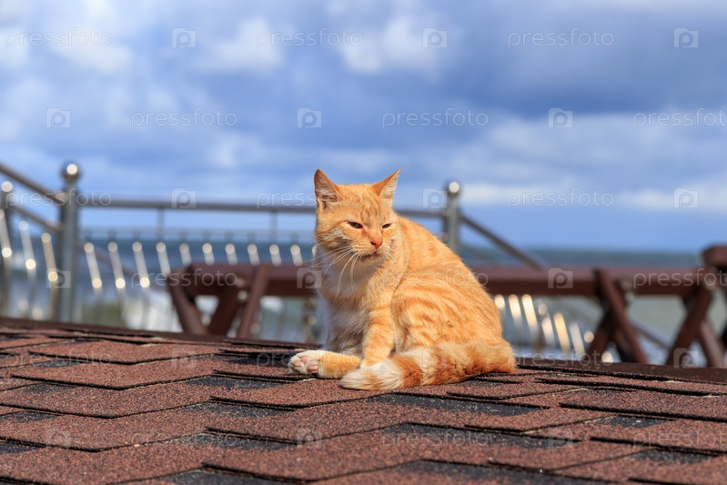 Россия, Зеленоградск. Сидящий рыжий кот на крыше. Вид на Балтийское море