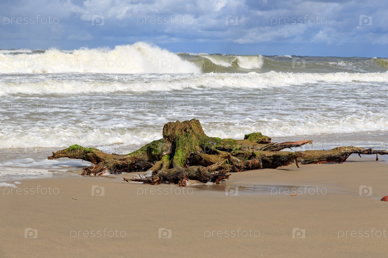 Пень с водорослями на пляже на фоне волн. Балтийское море, Куршская коса (Куршская коса)