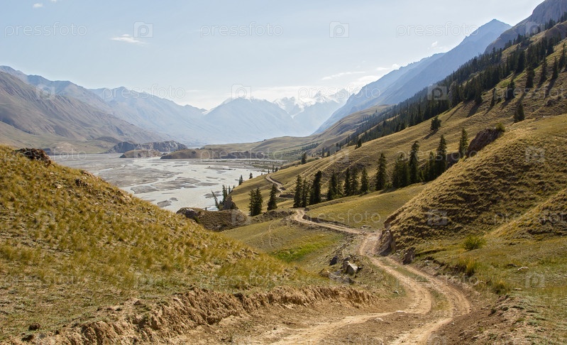 Горная долина с рекой и дорогой. Кыргызстан, Тянь-Шань