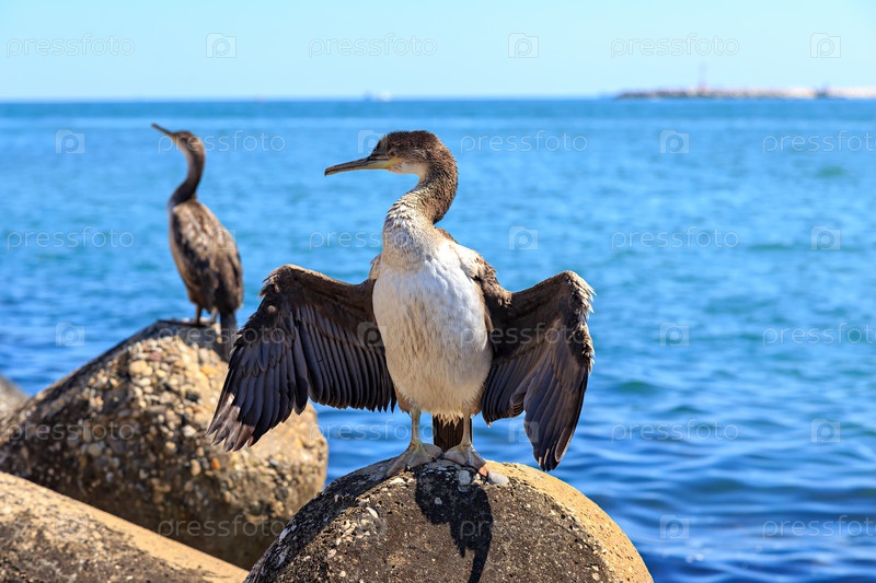 Венеция, Италия. Баклан сушит крылья на волнорезе