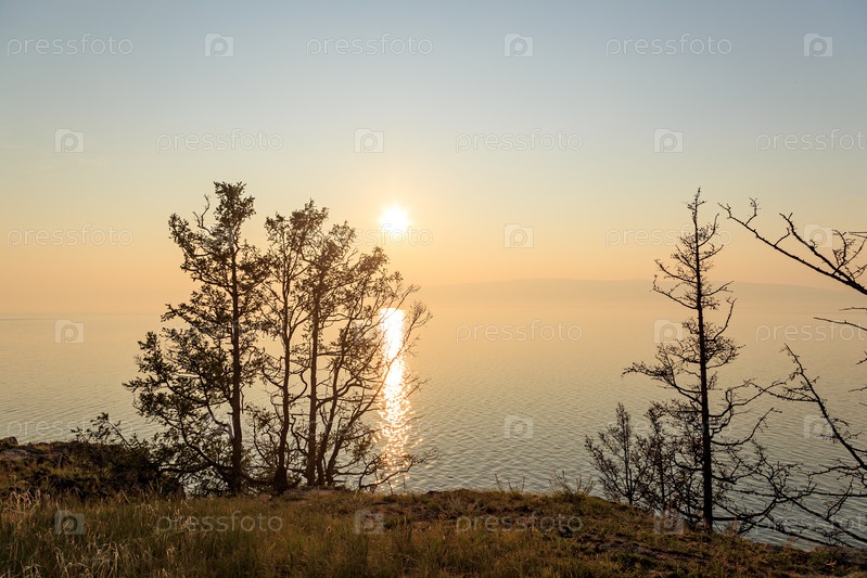 Заходящее солнце за ветвями деревьев над заливом Малого Байкала. Россия, остров Ольхон