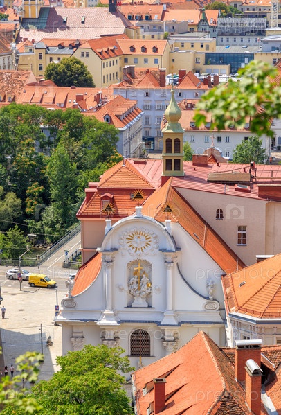 Грац, Австрия. Церковь Троицы (католическая церковь) Текст на скрижалях в верхней части БОГА - «Отец, Сын, Святой Дух»