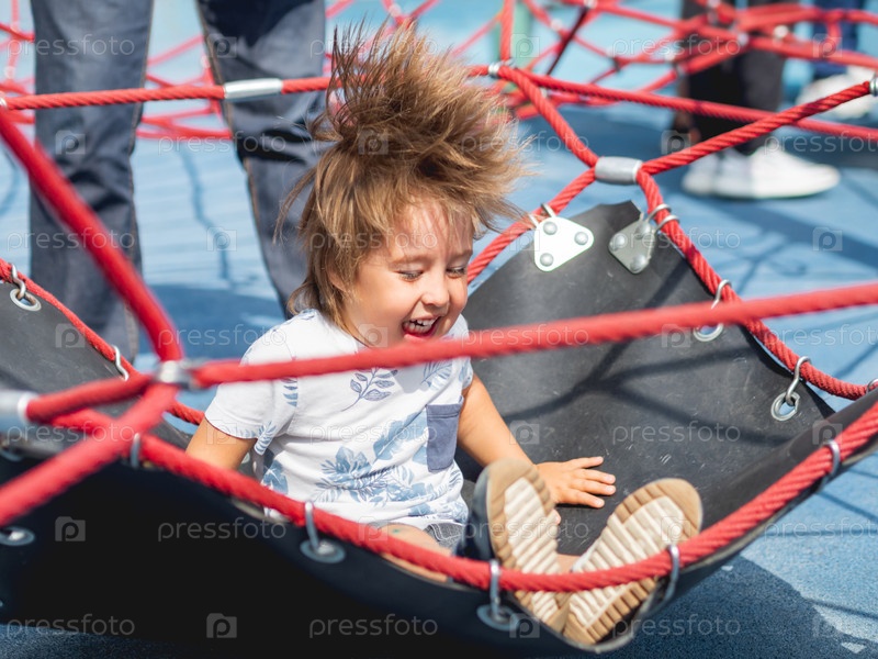 Смеющийся малыш прыгает на детской площадке. Уличное спортивное оборудование для физического развития детей. Летнее веселье