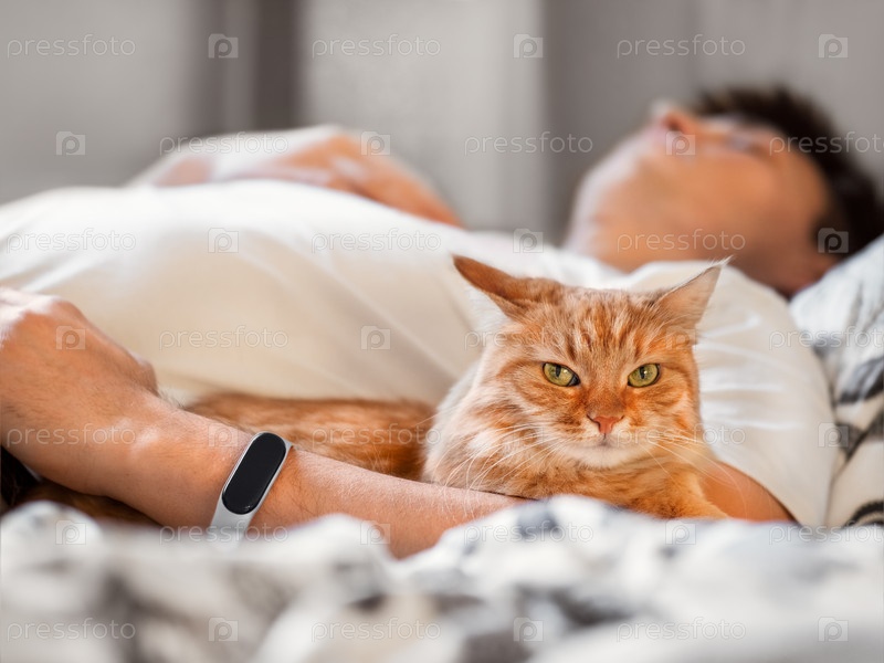 Милый рыжий кот лежит в постели со своим хозяином. Любитель кошек спит. Целебная сила домашних животных. Больной мужчина с пушистым питомцем в спальне