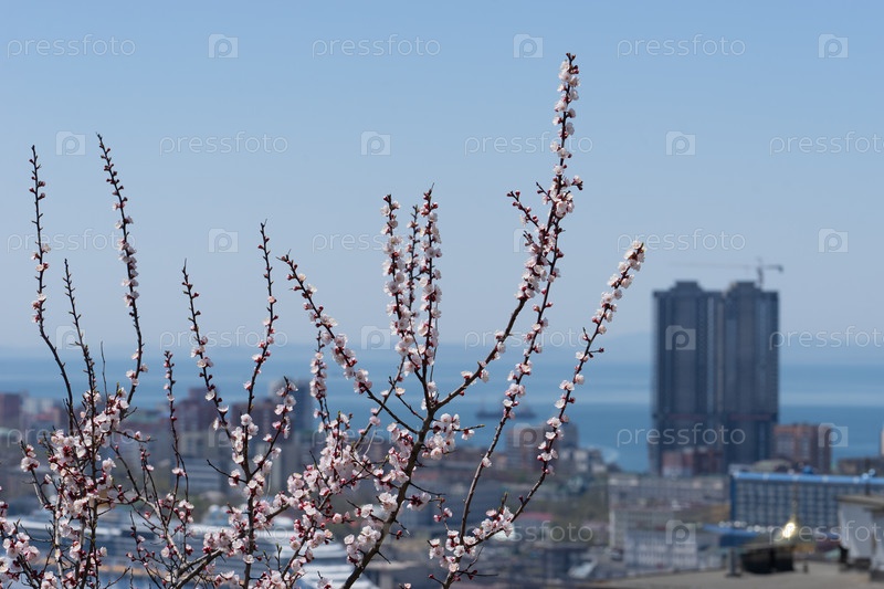 Цветущие ветки фруктового дерева на размытом фоне