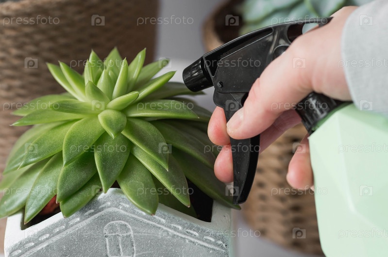 Женщина опрыскивает растения в цветочных горшках. Домохозяйка, ухаживает дома за комнатными растениями, опрыскивает суккуленты. Домашние цветы