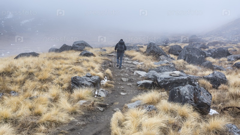 Турист поднимается по пути к базовому лагерю Аннапурны, Гималаи, Непал