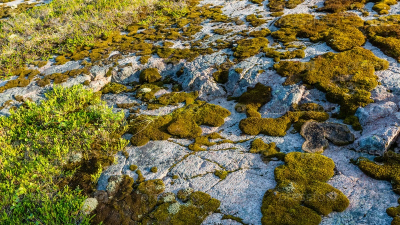 Селективный фокус, ярко-зеленый и коричневый мох и лишайник на камне в тундре